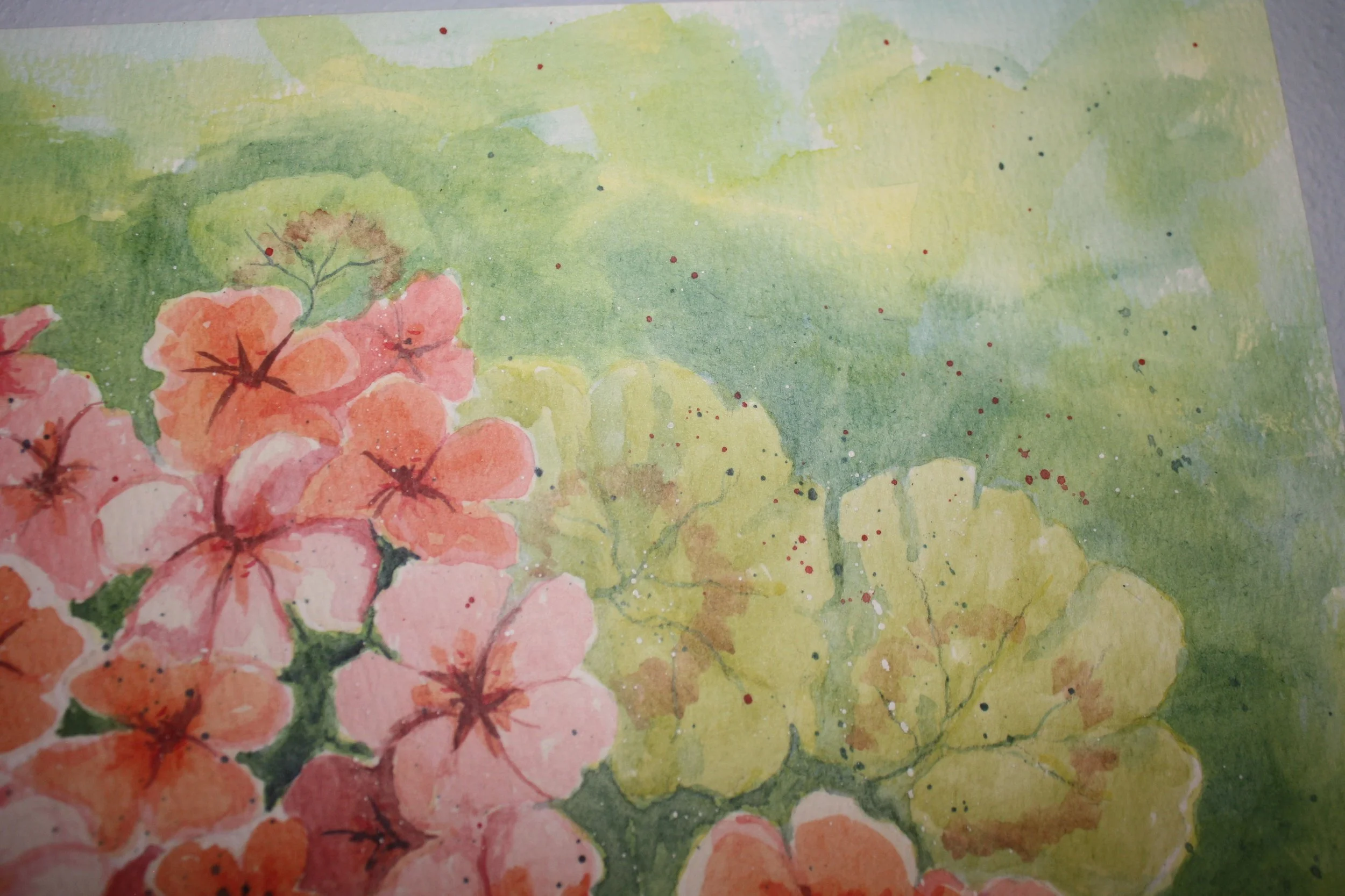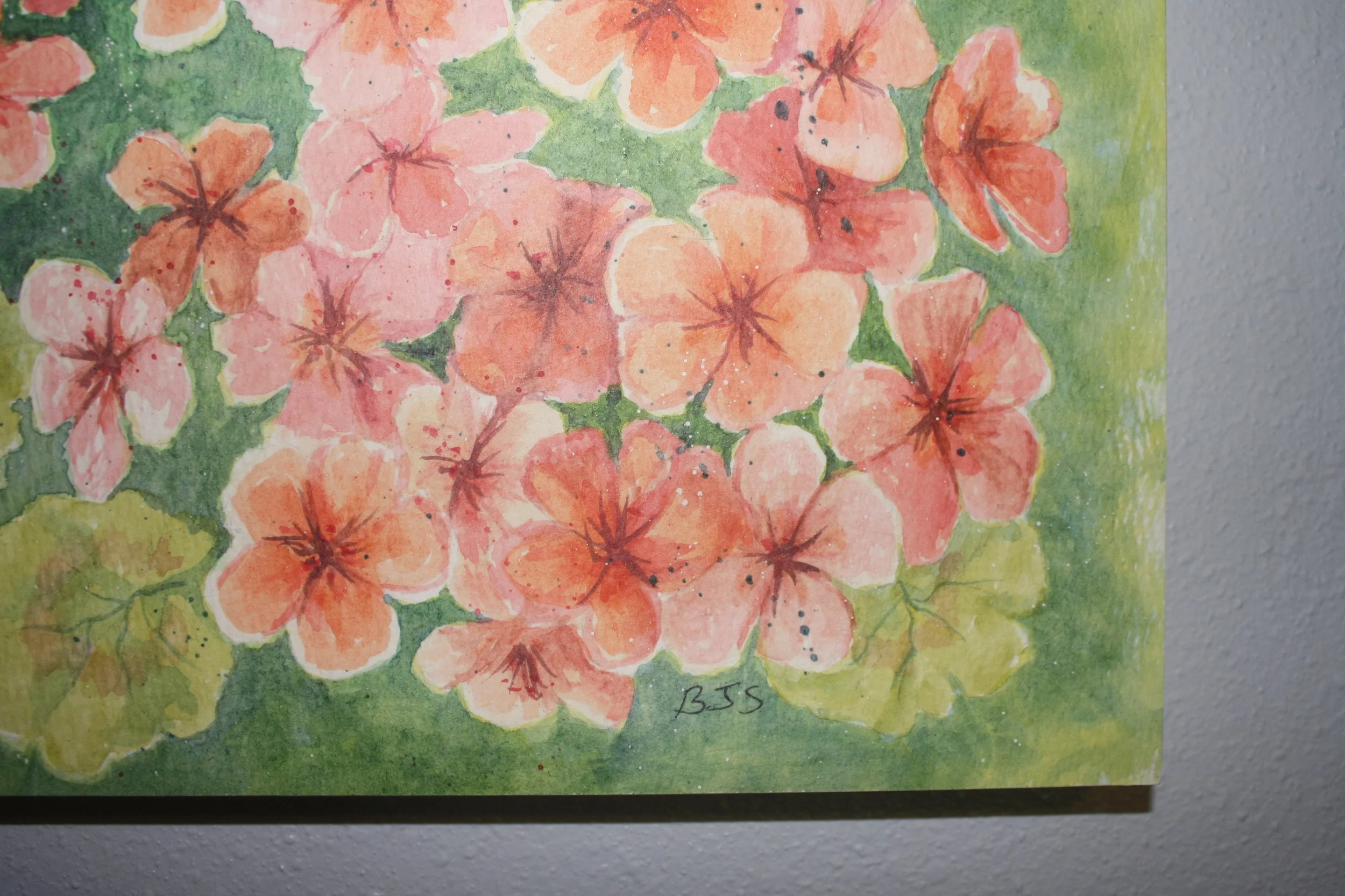 This small watercolor measures 8.5 by 11 inches and features yellow flowers on a dark background. It is mounted, matted and ready to frame.