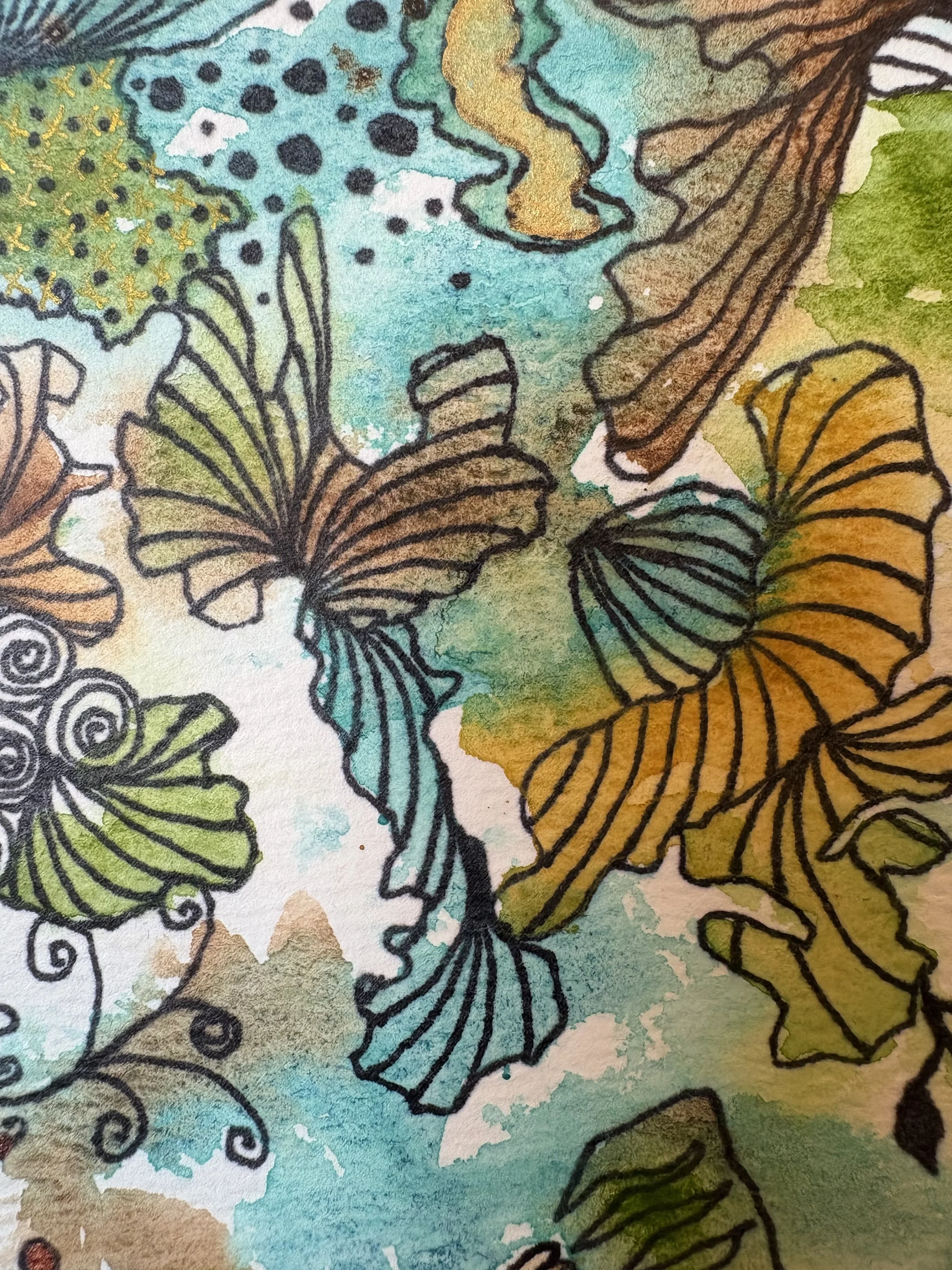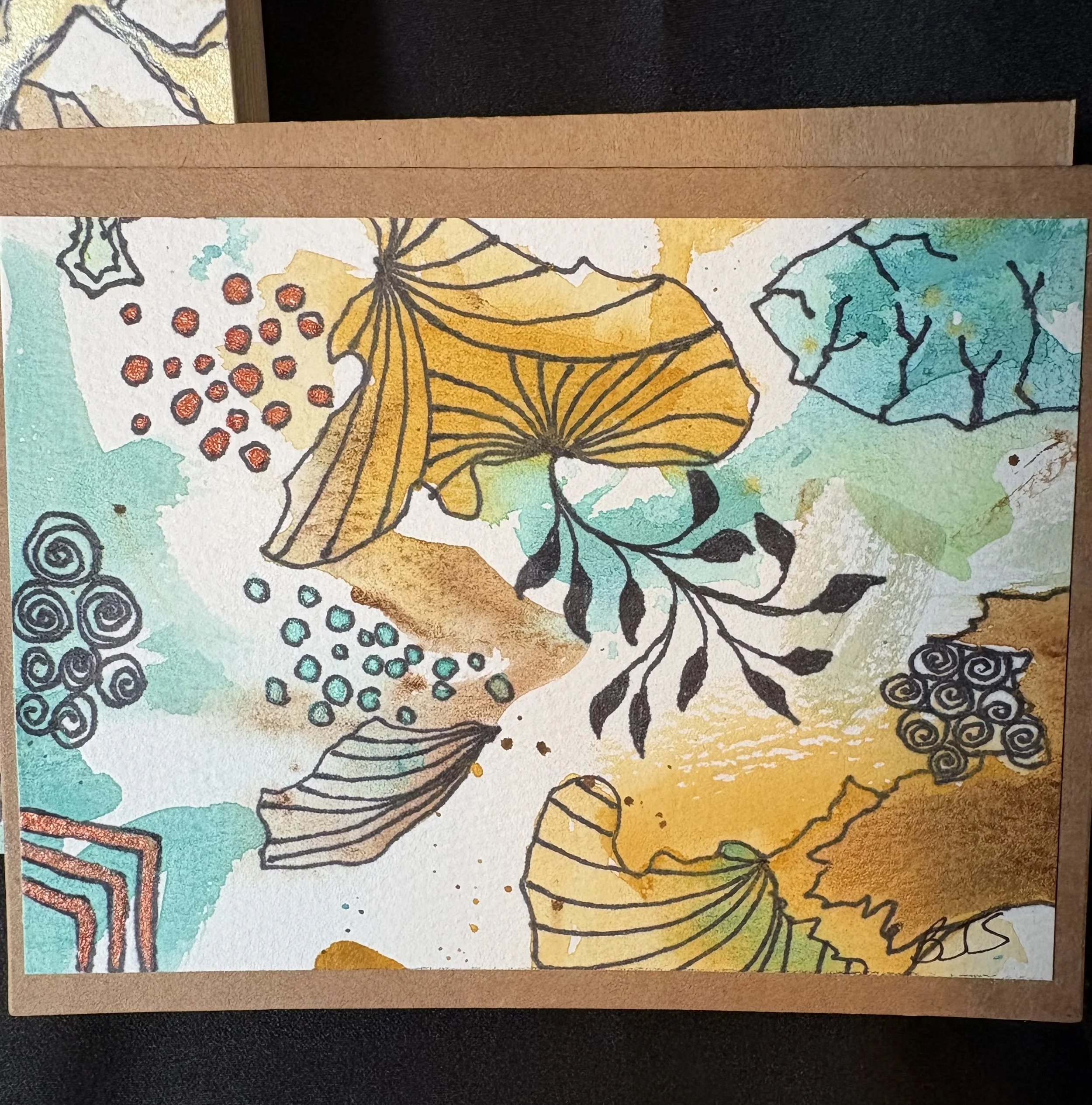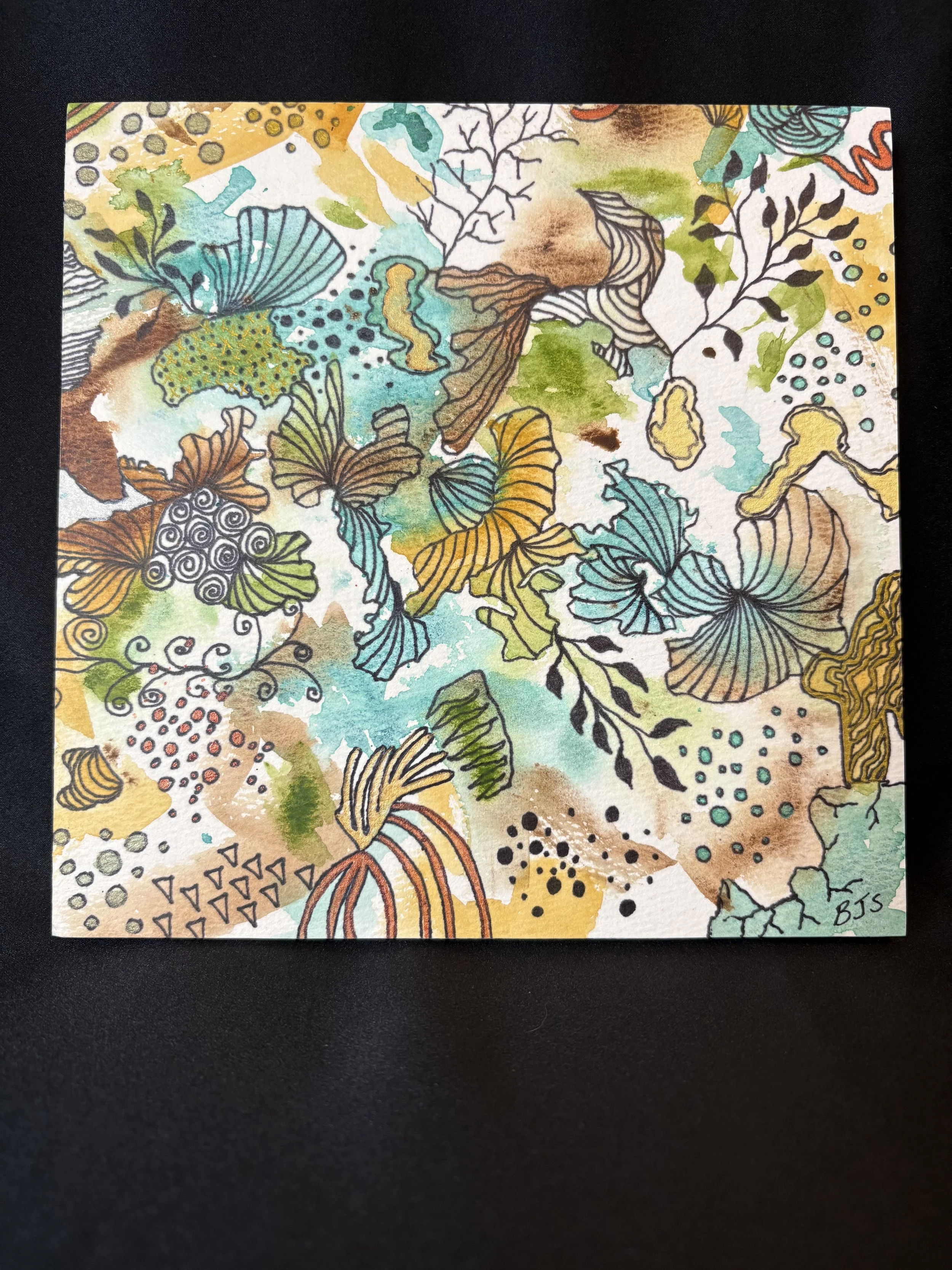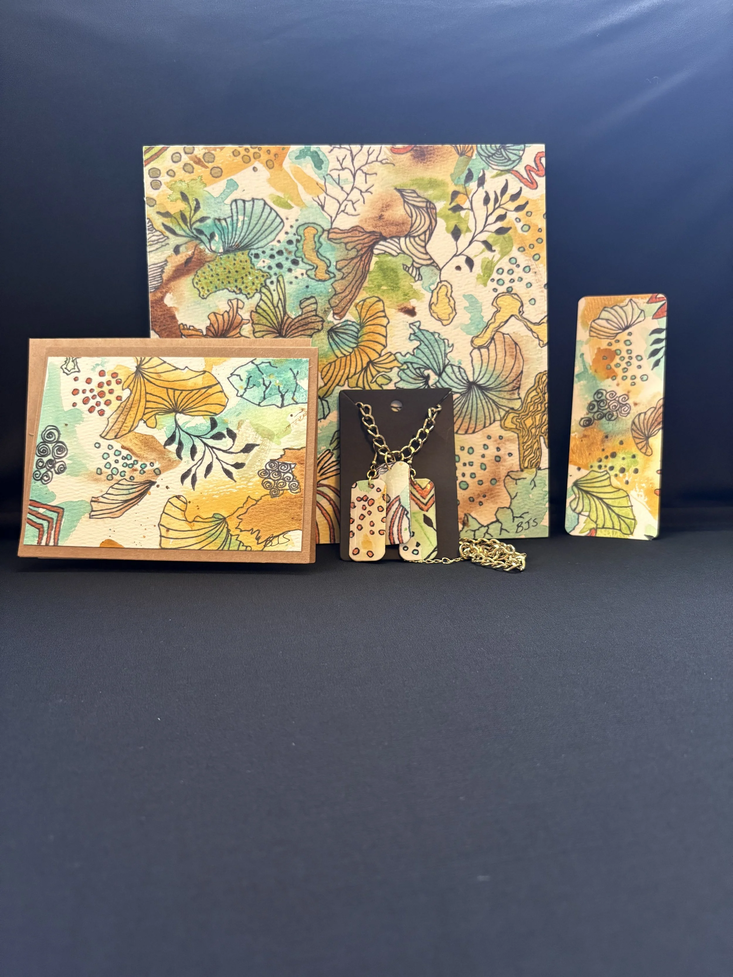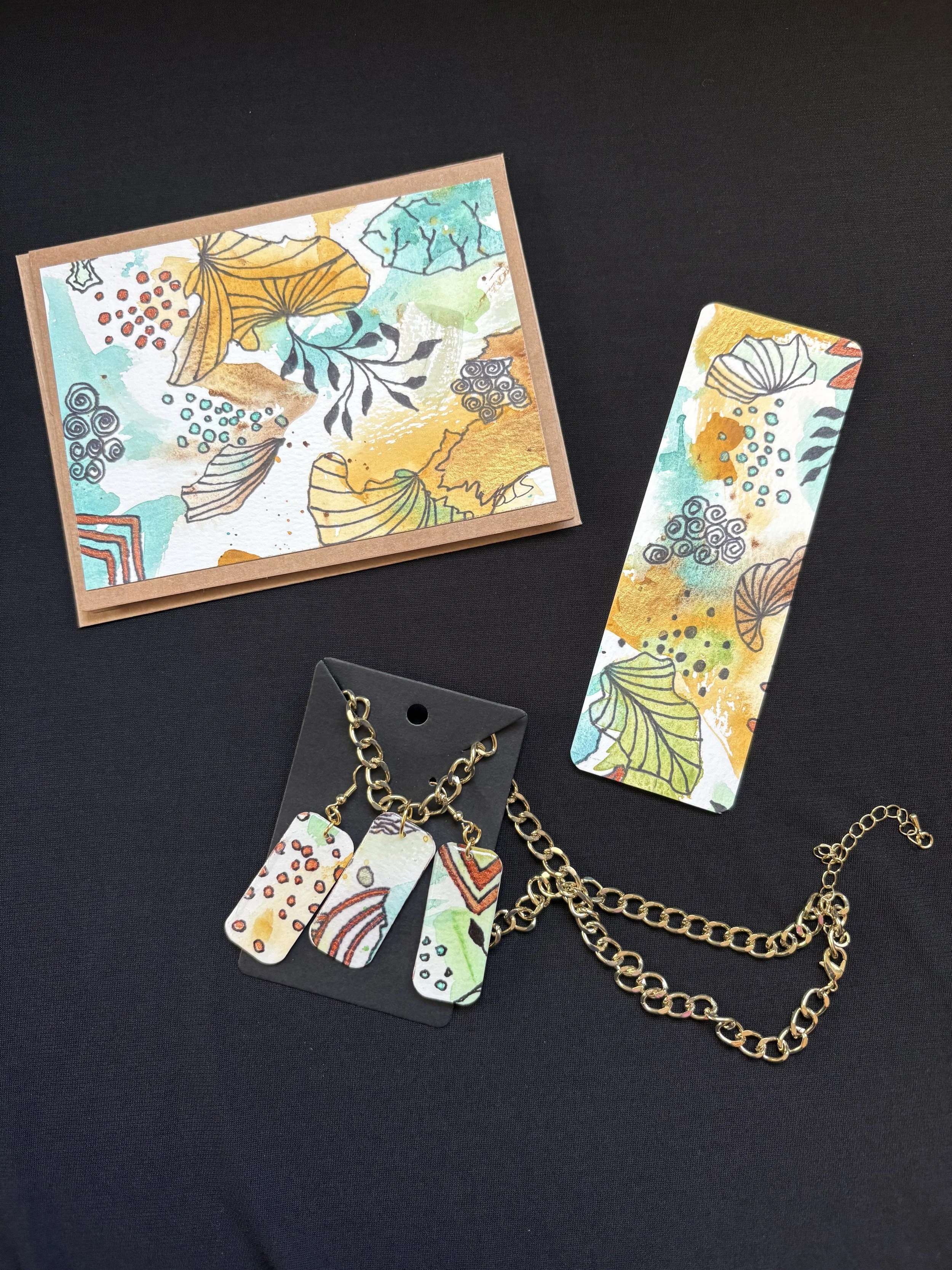 Small abstract painting is 8 by 8 inches, mounted on board and is ready to hang. The gift set includes matching pierced earrings, 1 ½ inches long; pendant 2 inches long with 22 inch gold colored chain ; a 5 ½ by 4 ¼ inch note card and a matching bookmark. The colors are a vibrant orange, with green purple and copper. Free Shipping